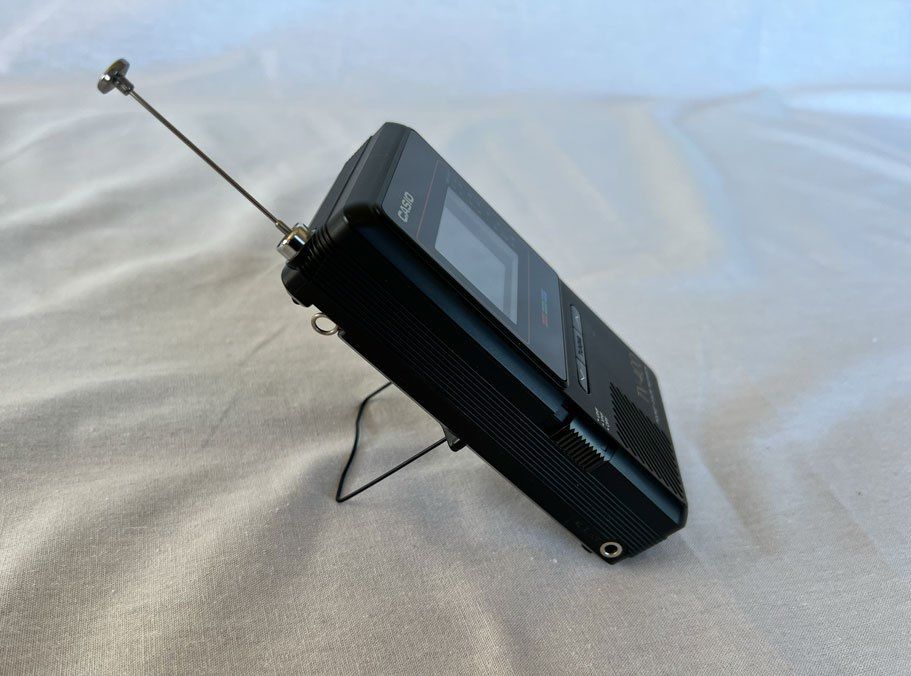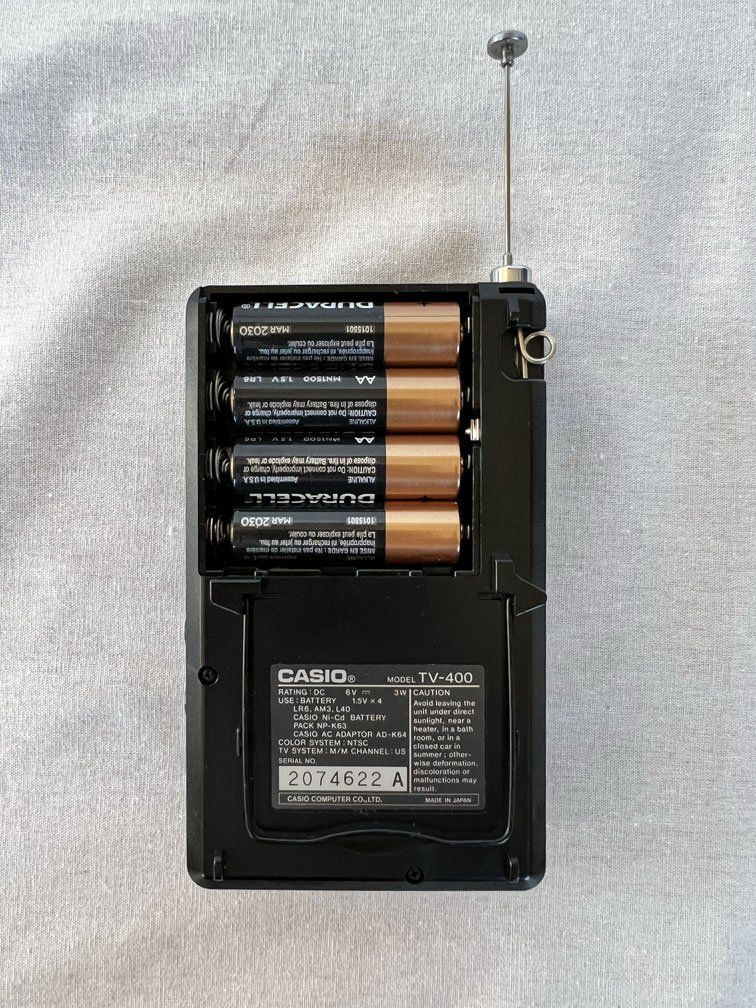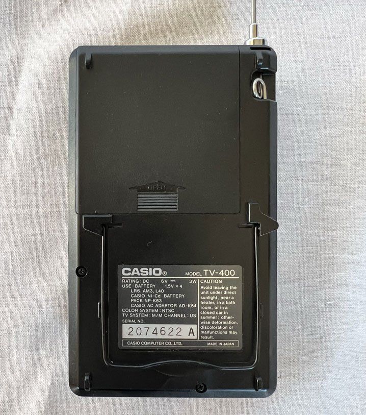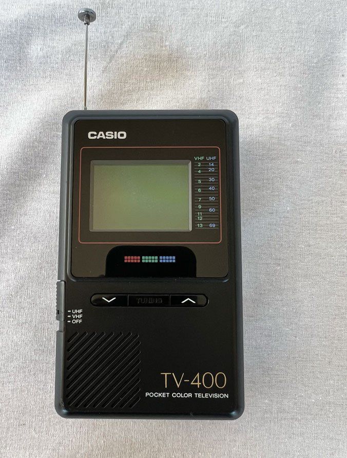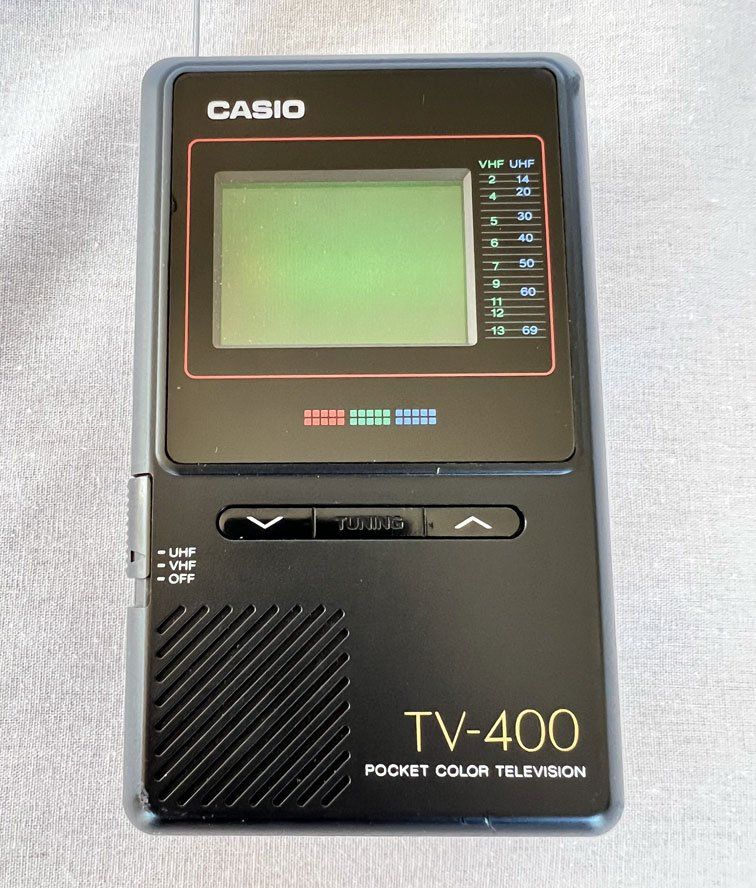 Casio introduced the TV-400 in 1987 and discontinued it in 1989. It featured a 2-inch color LCD, NTSC VHF & UHF tuner, 640x490 video, telescoping antenna, and a rechargeable battery pack. It came with this warning emblazoned on its backside: