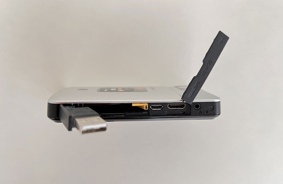 Its strongest selling feature is a jack for an external microphone, and an optional remote. There is an AV jack, Mini-HDMI and Micro-USB ports, and a flip-out USB connector.