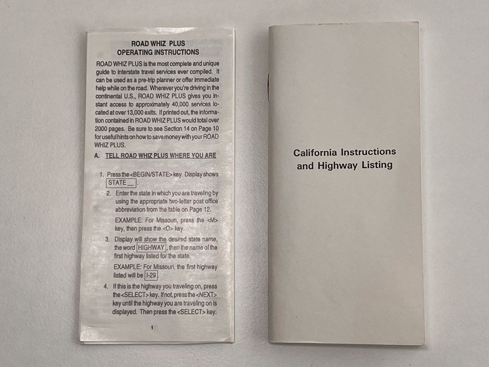 The Road Whiz was an early handheld navigator that did not rely on GPS. Ultradata Systems marketed the Road Whiz Ultra (Model 970) as an “Interstate Travel Guide, with directions to thousands of destinations and services along highways and in major metropolitan areas.