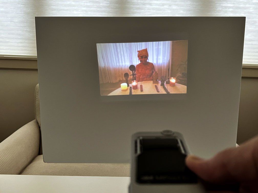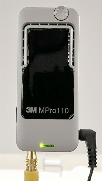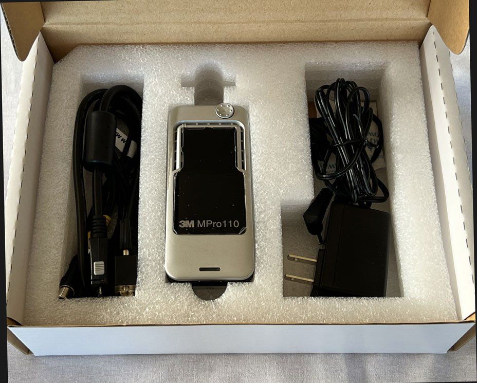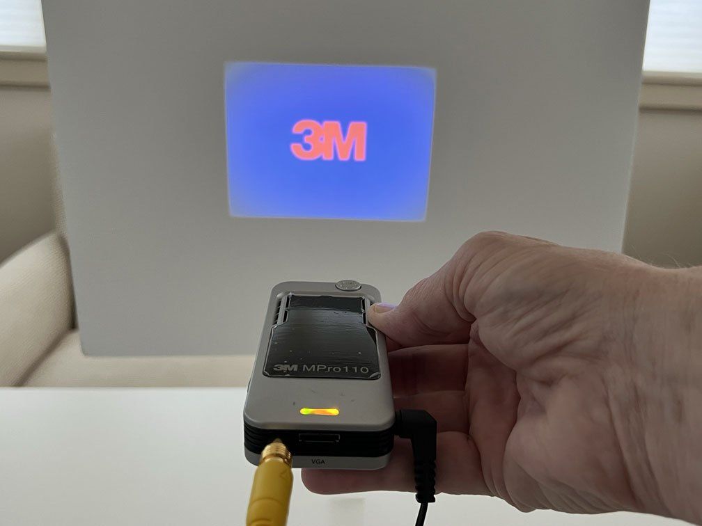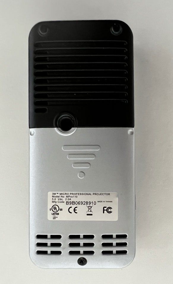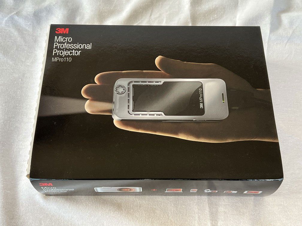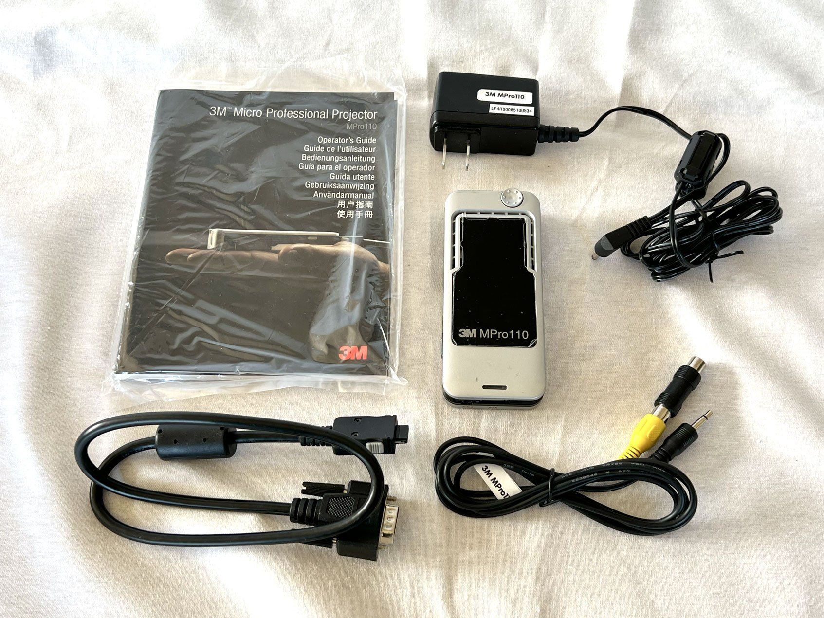 3M's MPro110 was manufactured from 2008 to to 2009. It was first in a class of so-called pico projectors. Its LCoS chip throws a bright image even under high ambient light. Although it will accept 720p video, all projected images are squeezed to 640x480. It lacks any provision for sound output or input.