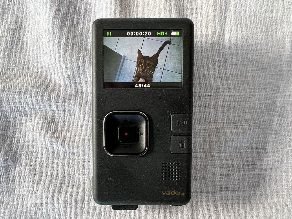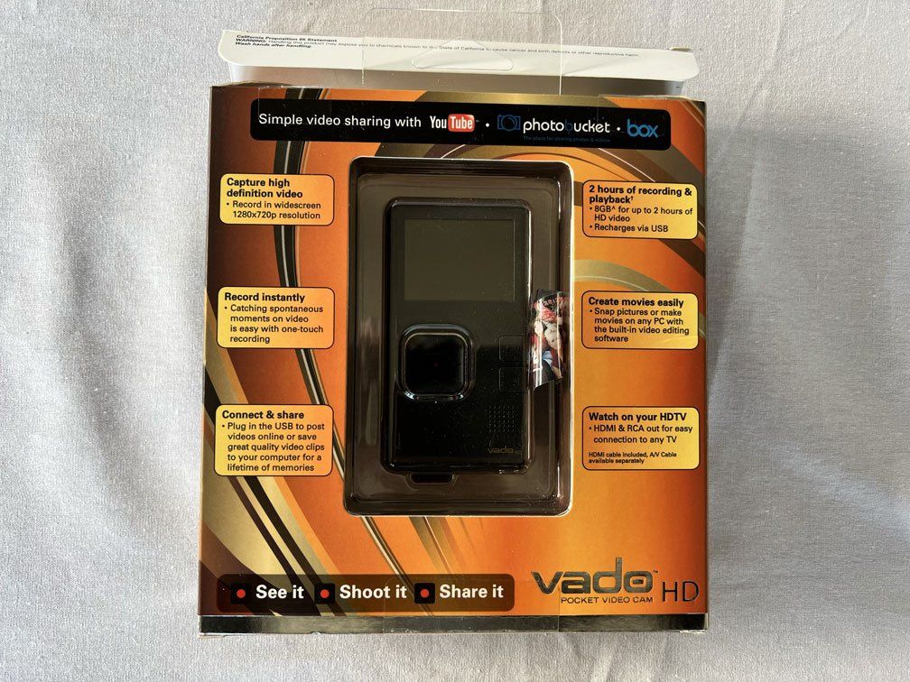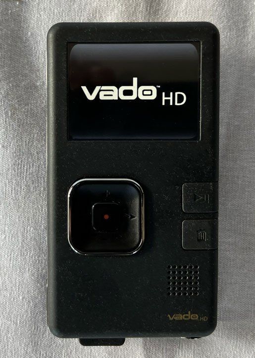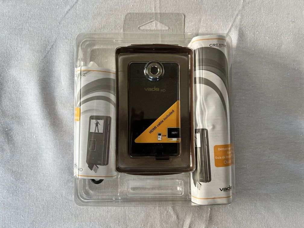 Creative Labs made 3 generations of the Vado series of cameras beginning in 2008. This one is the 3rd and final version, Creative Vado HD. It features a tripod mount and RCA-style component output. The batteries charge through a built-in USB cable. It captures 720p HD video in an .mp4 container and stores the movies in 8GB of internal memory. Reach the settings by depressing the Play/Pause and Delete buttons simultaneously.